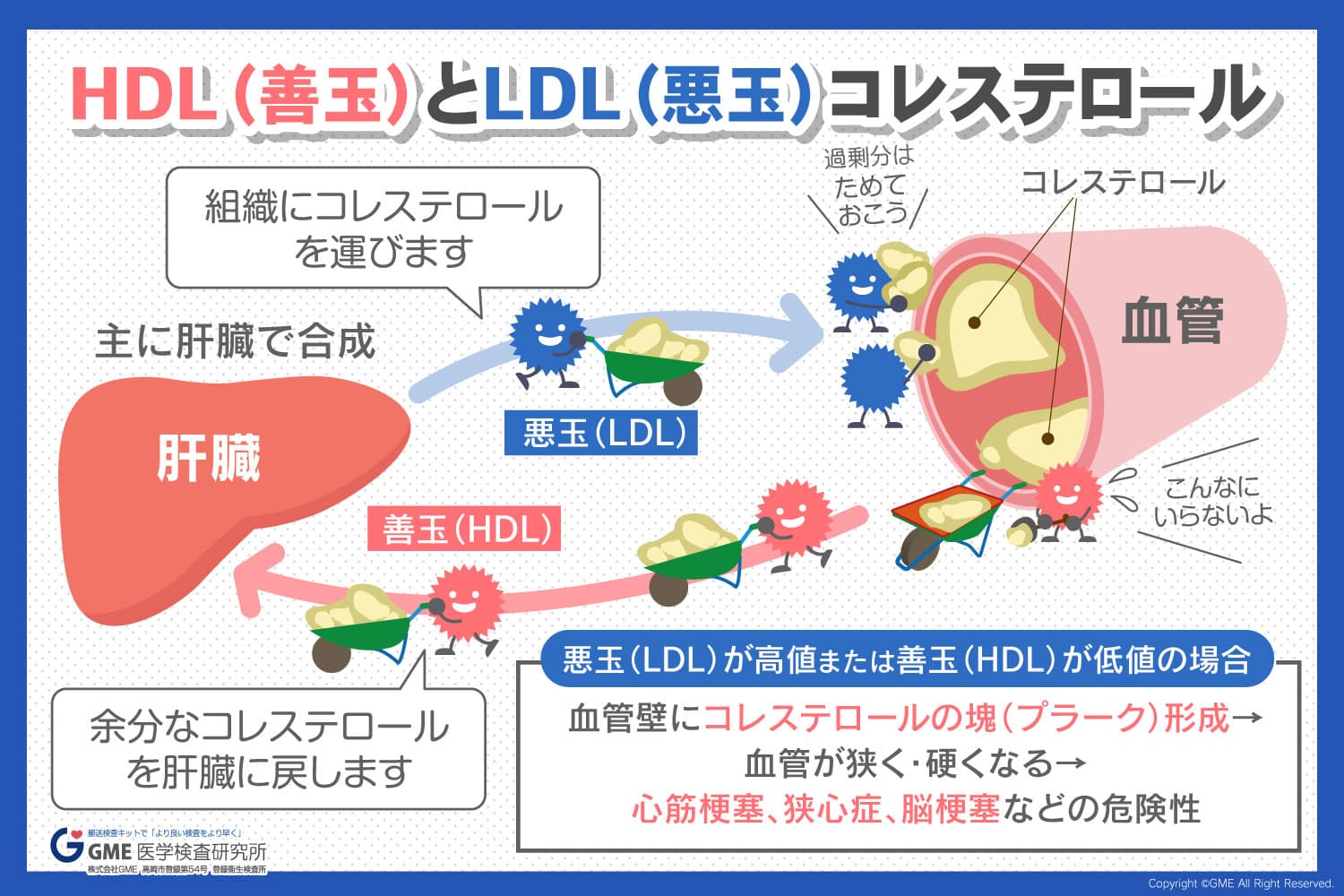 | HDLコレステロール(HDL-C) | 高比重リポタンパク質に含まれるコレステロール。余分なコレステロールを血管壁から回収し肝臓へ戻す成分。「善玉コレステロール」と呼ばれることが多い。 | 動脈硬化の予防に関わる。HDLコレステロールが多いほど余分なLDLコレステロールなどのコレステロールが除去されやすく、正常な血管を維持するのに有利。 |